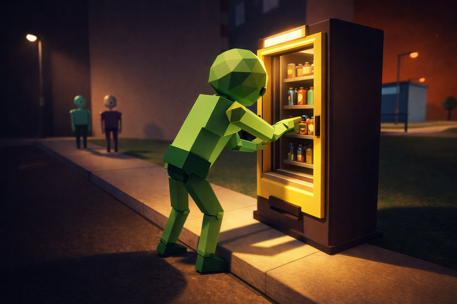 Start small — just a little cash and one machine. Head to the supply store, carry boxes back yourself, unpack them, and stock your machines by hand. NPC citizens wander the city all day, stopping to buy snacks from machines you've placed in the right spots.