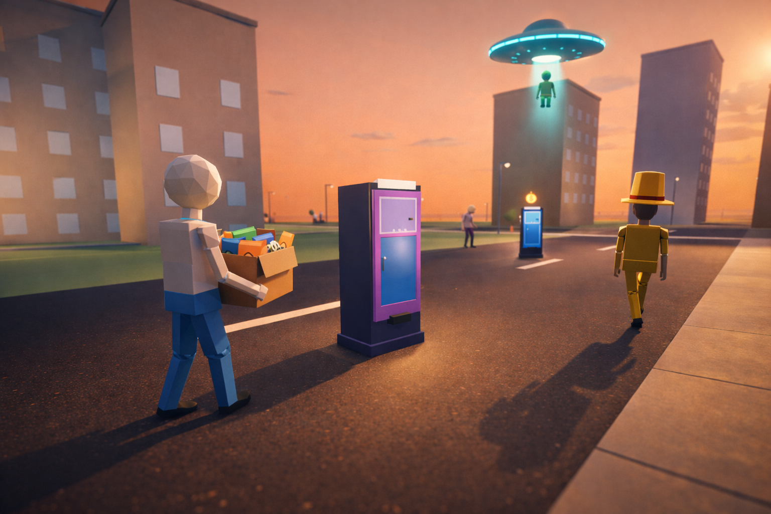 Vending Empire is a first-person simulator where you build your own vending machine business across a living, breathing city.